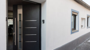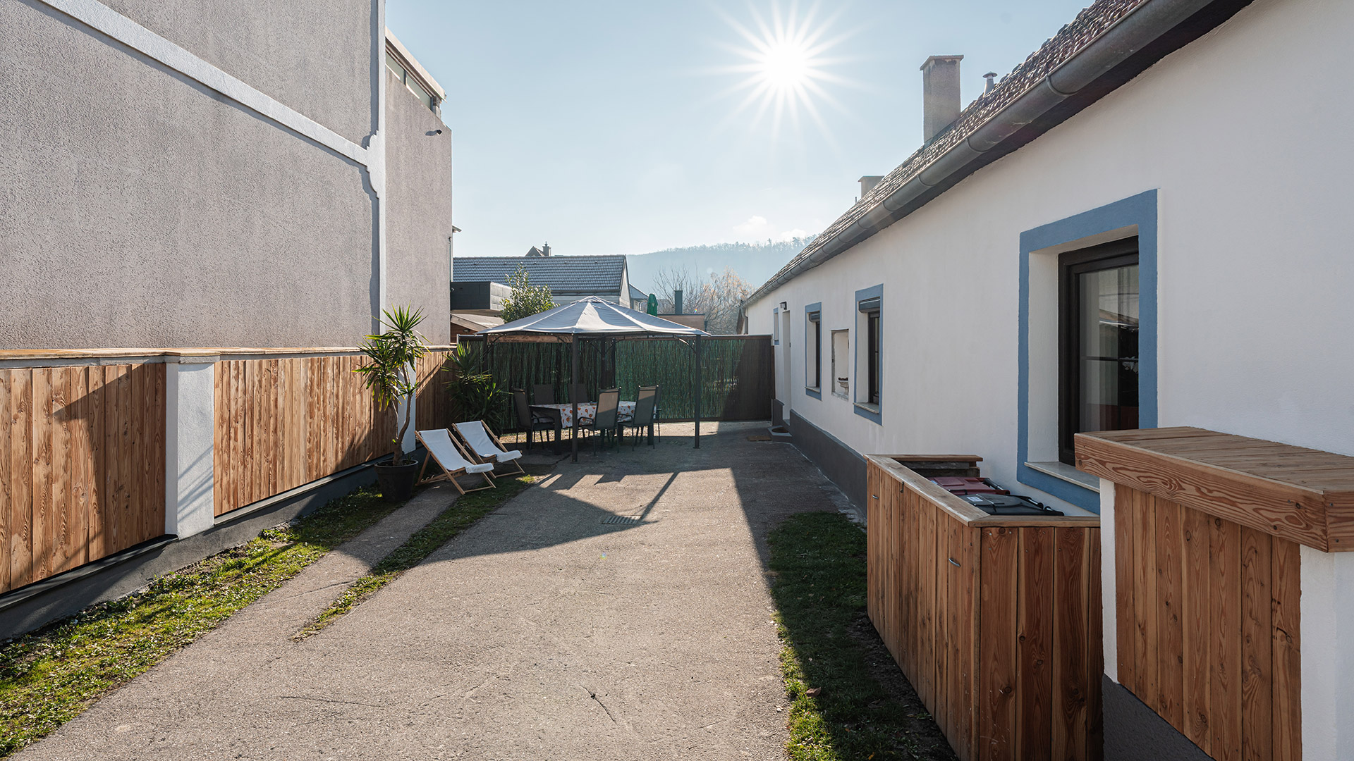 der Hinterhof ist durch ein großes, automatisches Einfahrtstor nicht einsehbar