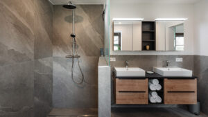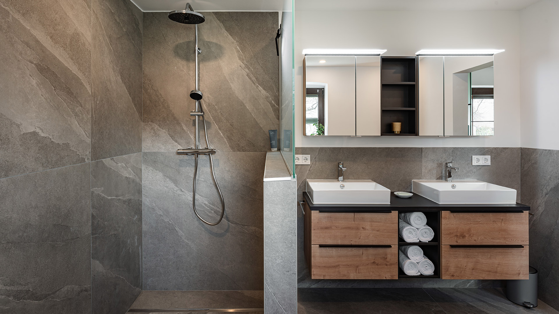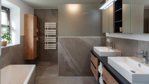 mit Doppelwaschbecken, Badewanne und Regendusche