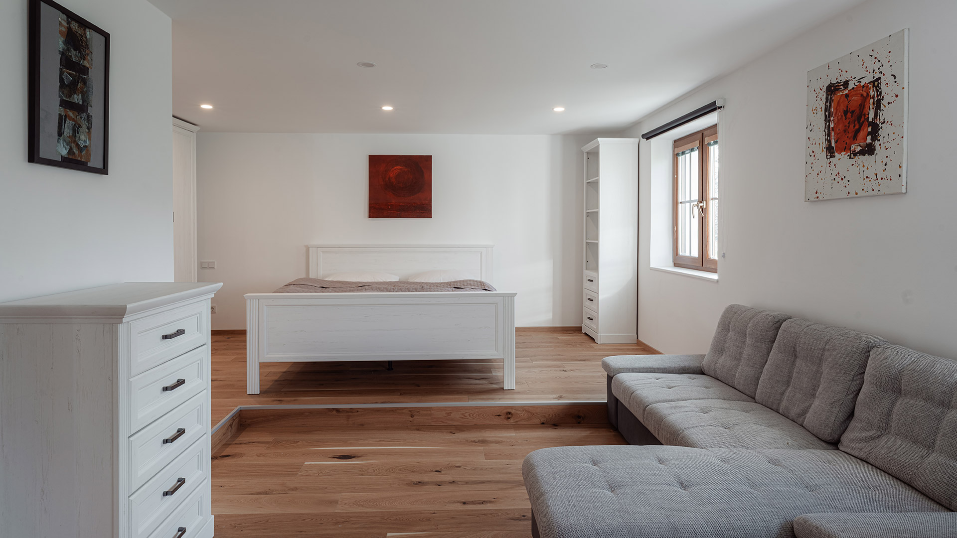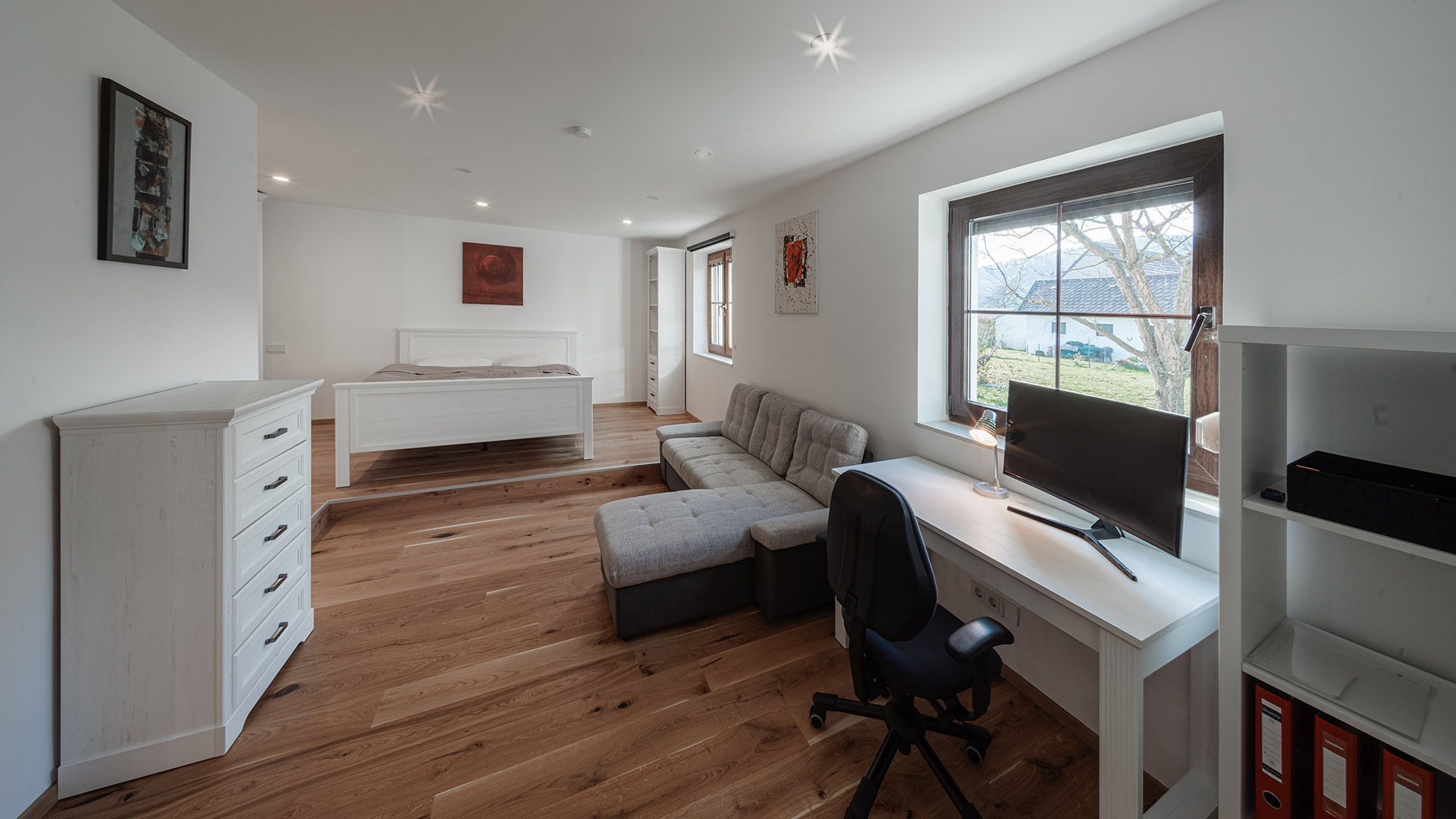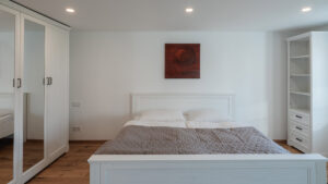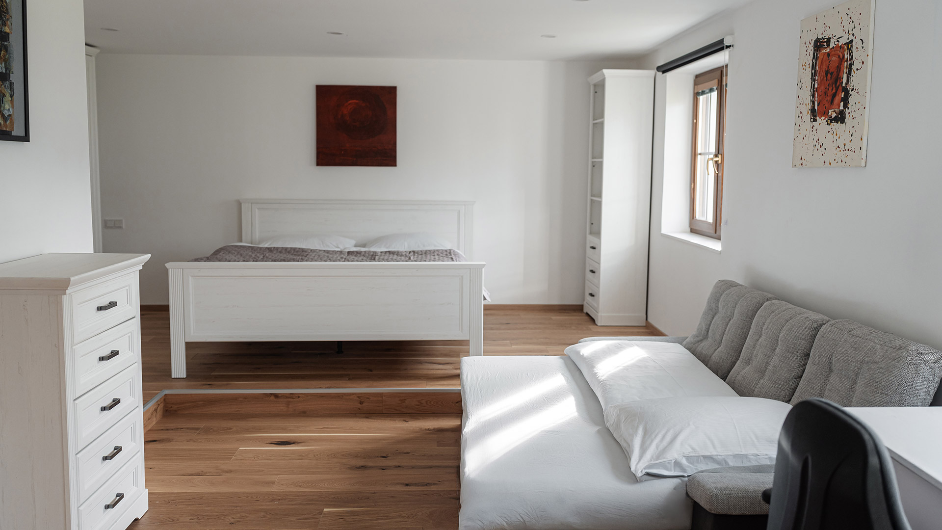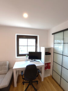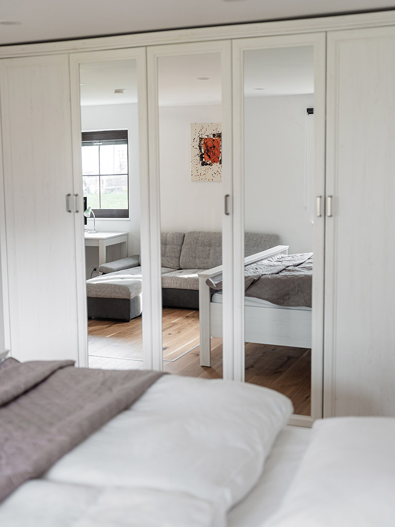 ein großes Bett 1,80 x 2 m und eine Ausziehcouch. Ein großer Schrank, zwei kleinere Schränke und ein Schreibtisch mit Ablagefläche.
