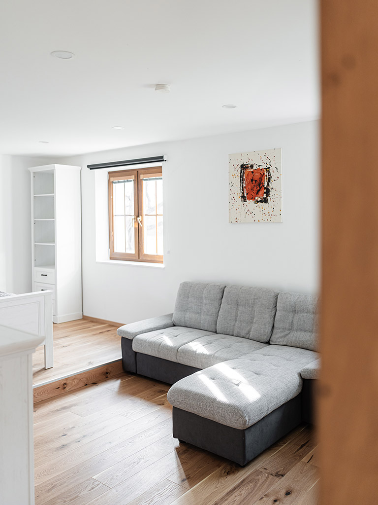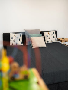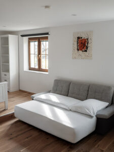 im Wohnbereich: 1x großes Bett (1,80 x 2 m) – wird als Couch oder als zusätzliches Bett genutzt